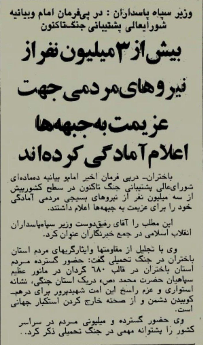 تاکنون جنگ ما با عراق درجبهههای غربی بود و ما نیروی کمتری را احتیاج داشتیم، اما اکنون به احتمال قوي بایدبخشی از نیروهای خود را درخلیجفارس به کار گیریم. همه جوانهایی که دوره دیده اندامروز بایـدحرکت کنند و درجبهه حضور یابندتا درصورتیکه تحولاتی رویداد از نظر نیرو در مضیقه نمانیم