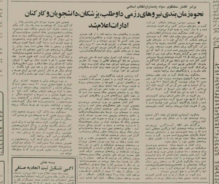 -آنهاییکه توان شرکت درجبهههاي جنگ را دارند "چه به صورت رزمنده وچه به صورت تخصص" آماده ثبت نام برای اعزام شوند.»