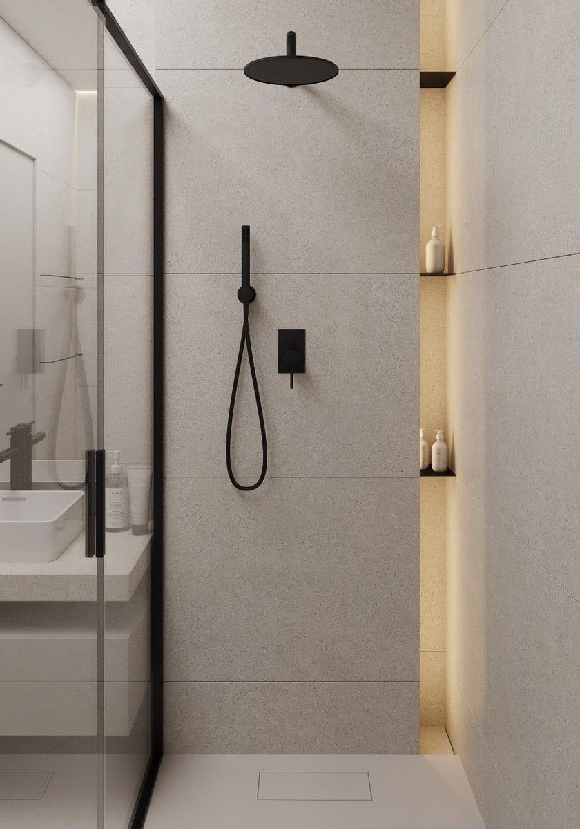 يتم إضافة بروز للجدار بمقدار 10-15سم، وهو عبارة عن اسمنتبورد ضد الماء والرطوبة وتقدر تركّب عليه البورسلان