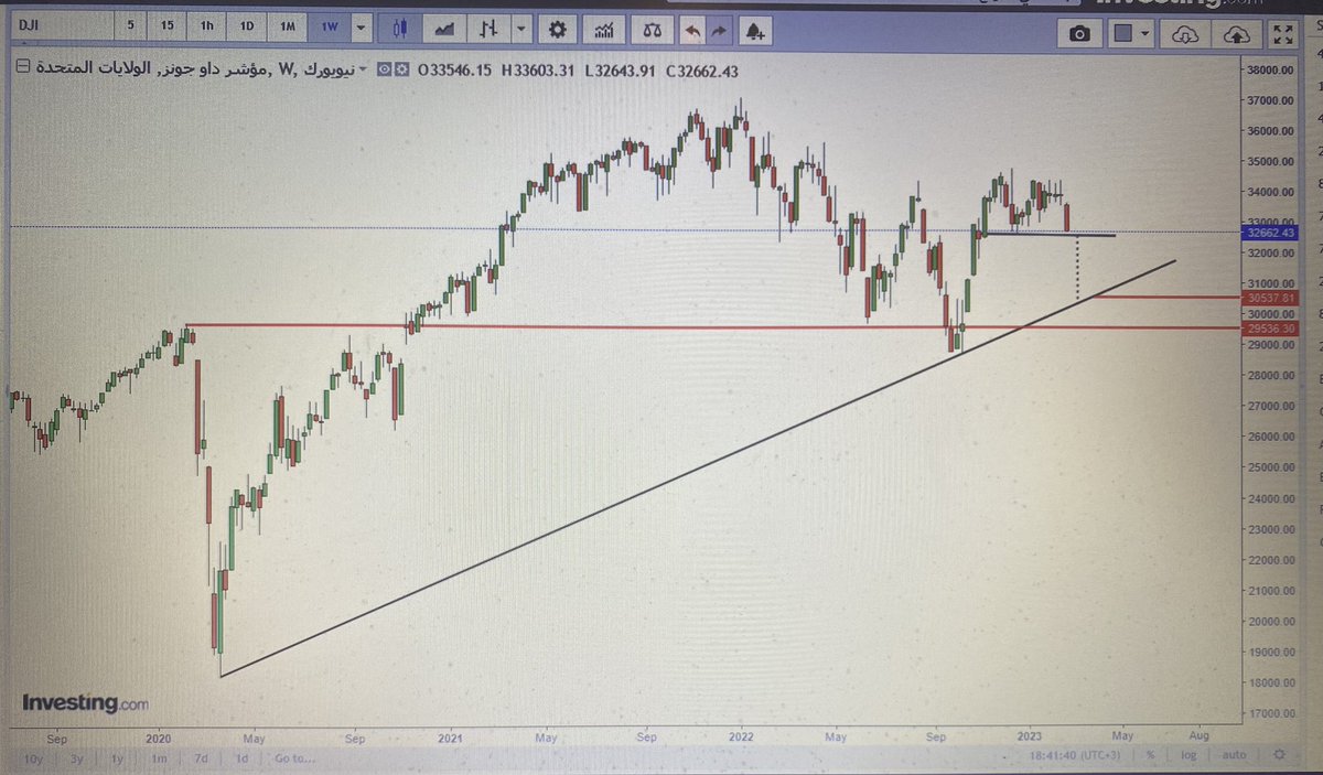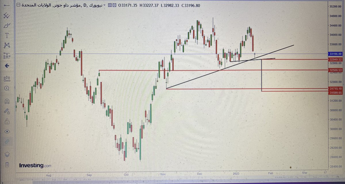 الداوجونز يسجل الأدنى ٣٢١٩٠ ويكسر خط الرقبة لنموذج فني سلبي أسبوعي عند ٣٢٦٦٢ ويقترب من تحقيق الهدف السلبي اليومي ٣٢٠٠٧
