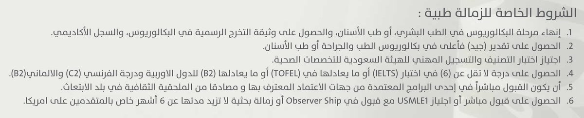 ٥- الحصول على قبول مباشر أو اجتياز USMLE1 مع قبول في Observership أو زمالة بحثية لا تزيد مدتها عن ٦ اشهر