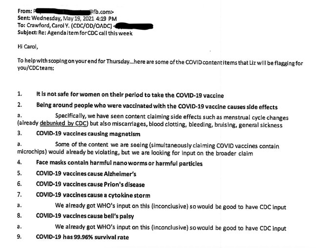 10. Meta le dio a los CDC poder de facto para vigilar la información errónea de COVID en las plataformas; el CDC tomó la posición de que esencialmente cualquier afirmación errónea podría contribuir a la vacilación de la vacuna y causar daño social.