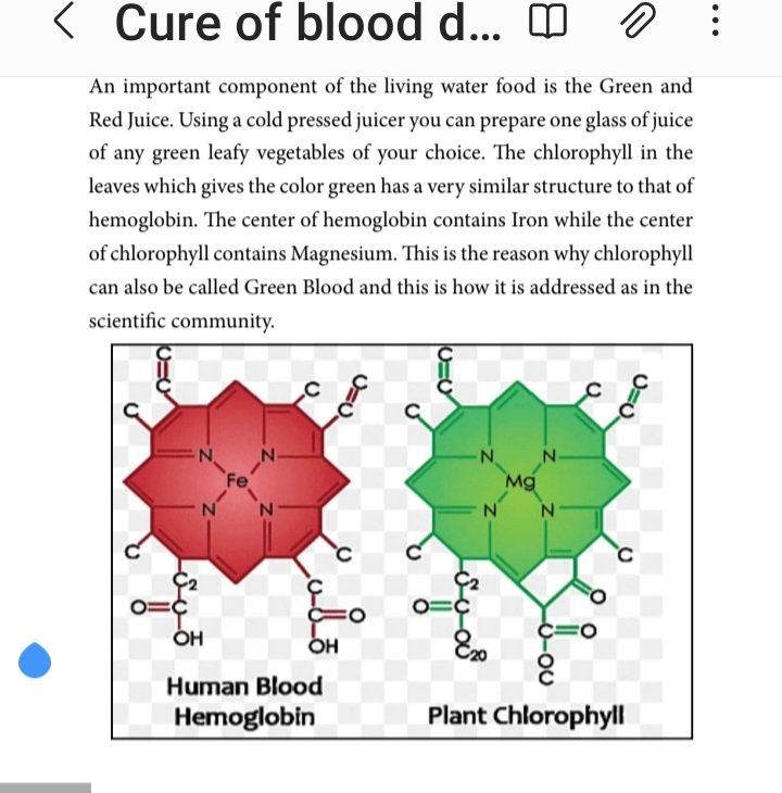 مليء بالكلورفيل الطبيعي. وهو يشبه الدم. . في مركز ذرة الدم يوجد الحديد وفي مركز الكلوروفيل يوجد المغنسيوم كما في الصورة فوق.