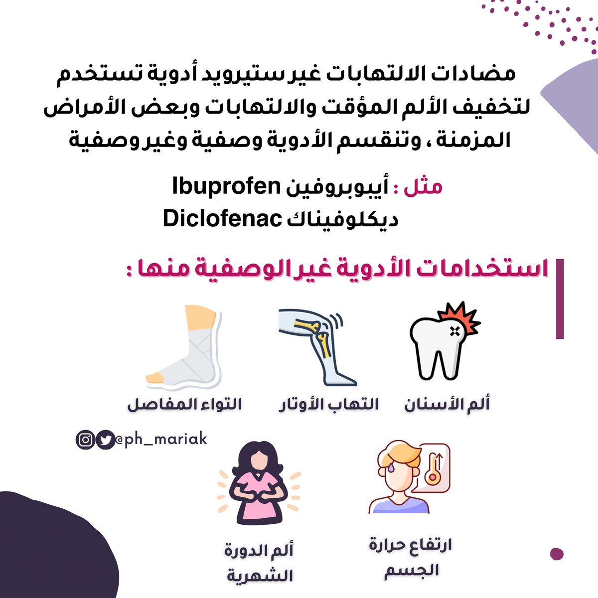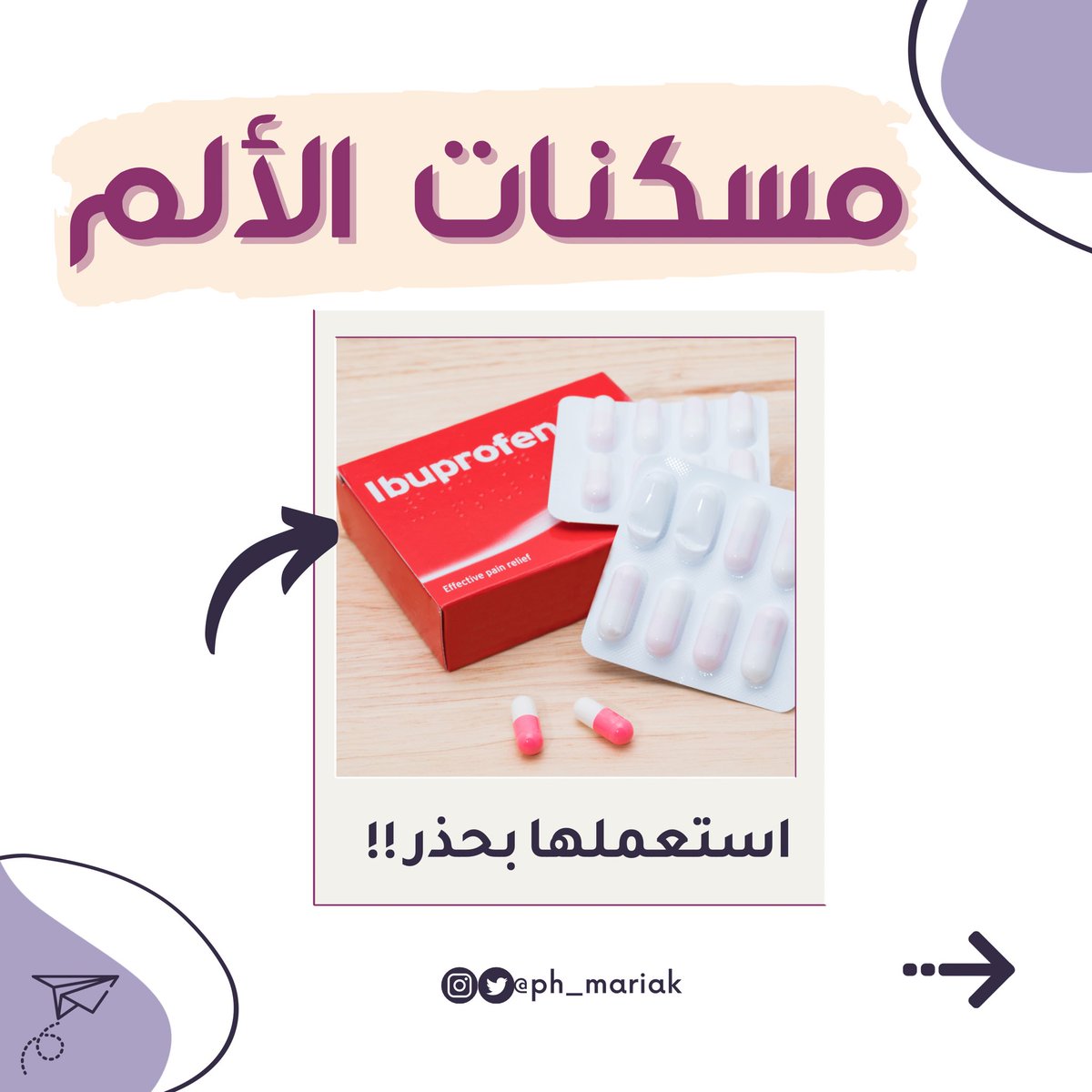 مسكنات الألم من انواعها مضادات الالتهابات الغير ستيرويدية مثل البروفين ، ديكلوفيناك 💊 .. وهذه بعض استخداماتها وتؤخذ غالباً بدون وصفة طبية 📑 ✨