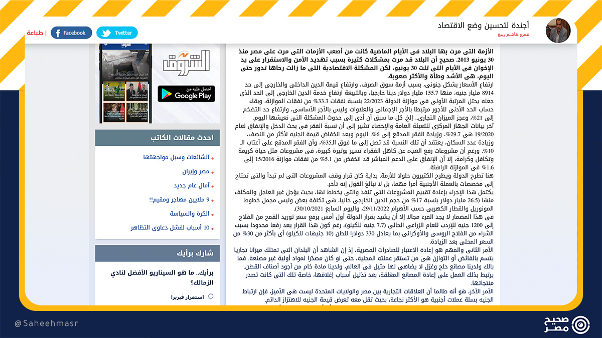 💬 جاءت تصريحات عمرو هاشم ربيع في متن مقاله المنشور بجريدة الشروق تحت عنوان "أجندة لتحسين وضع الاقتصاد".