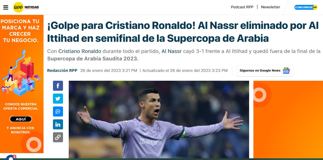💥💥 صحيفة "publimetro" المكسيكية: "إقصاء كريستيانو رونالدو من كأس السوبر السعودي.. ارتدى المهاجم البرتغالي شارة الكابتن لكنه فشل في منع إقصاء #النصر.. يواصل رونالدو عجزه عن التألق بعد خسارة النصر 3-1 أمام #الاتحاد في نصف نهائي كأس السوبر السعودي".