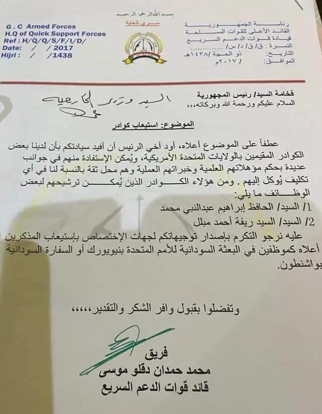 محمد حمدان دقلو ( حميدتي) ، مخاطبًا فيها الرئيس المعزول عمر البشير، باستيعاب اقرباءه الحافظ ابراهيم عبدالنبي والسيد ريفة أحمد مبلل، في البعثة السودانية للأمم المتحدة بنيويورك أو بالسفارة السودانية بواشنطن.