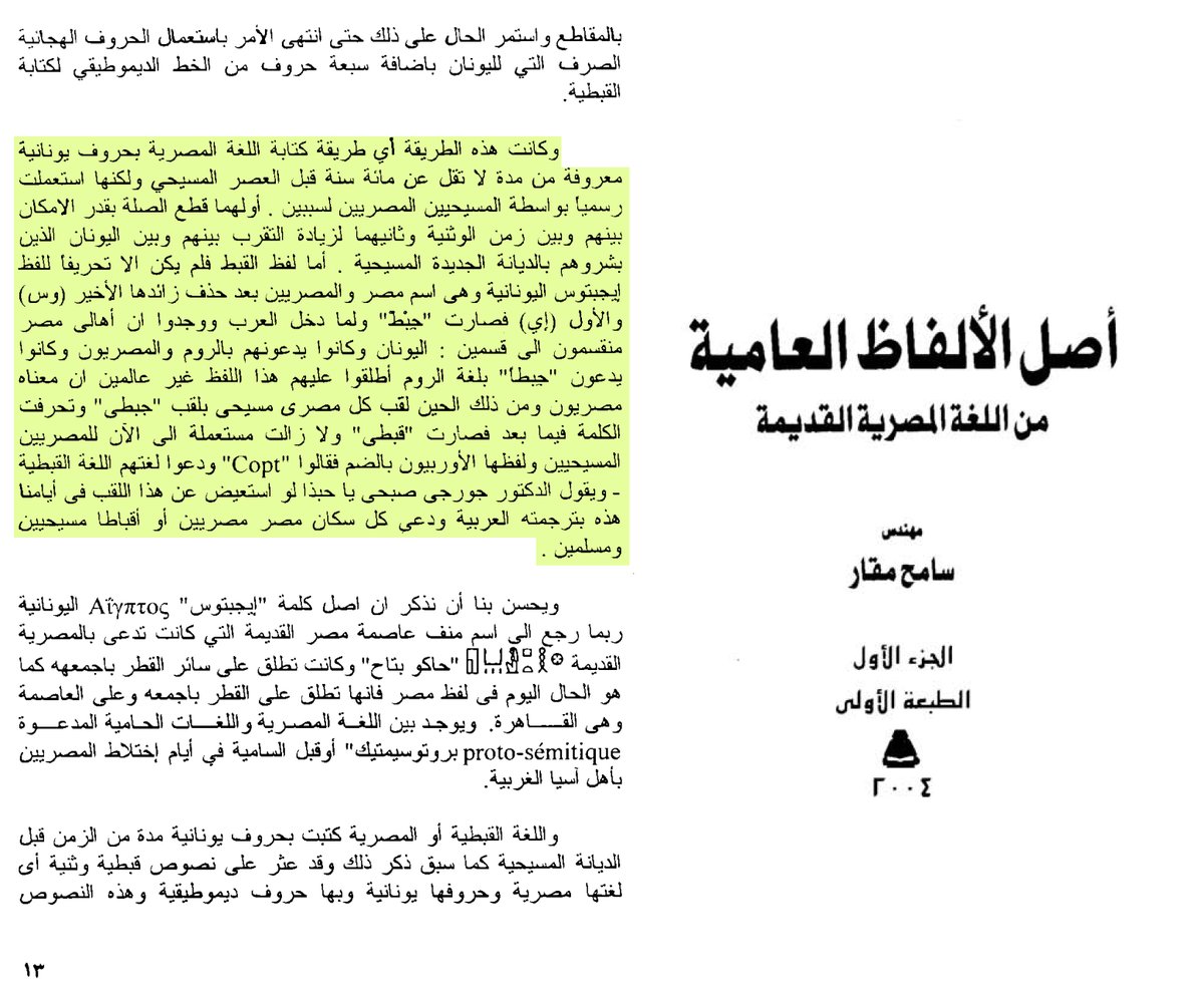 يحاول نصارى اليوم التلصق بحضارةالقدماء رغم أن معول هدم تلك الحضارة كان الدين المسيحي فقد عمل على تدمير آثارها واستبدال حروفها المصريةبحروف الغازي اليونانية نبذا لدين القدماء وتقربا للغة الإنجيل وسبق المسلمون شمبليون بحلها