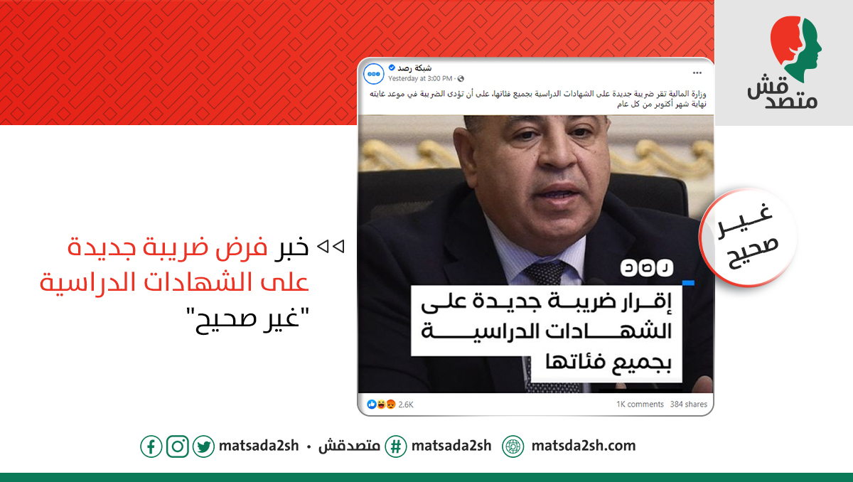 - أخبار وبوستات منتشرة بشكل كبير جدًا، بتقول: "وزارة المالية تقر ضريبة جديدة على الشهادات الدراسية بجميع فئاتها، على أن تؤدى الضريبة في موعد غايته نهاية شهر أكتوبر من كل عام". ❌❌