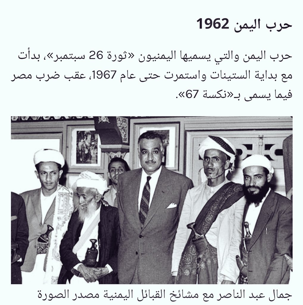 انتصرت مصر عسكريًا في حرب اليمن ونشأت الجمهورية العربية اليمنية والقضاء على المملكة #المتوكلية يدعي البعض انه عبدالناصر خلص اليمن من الرافضة