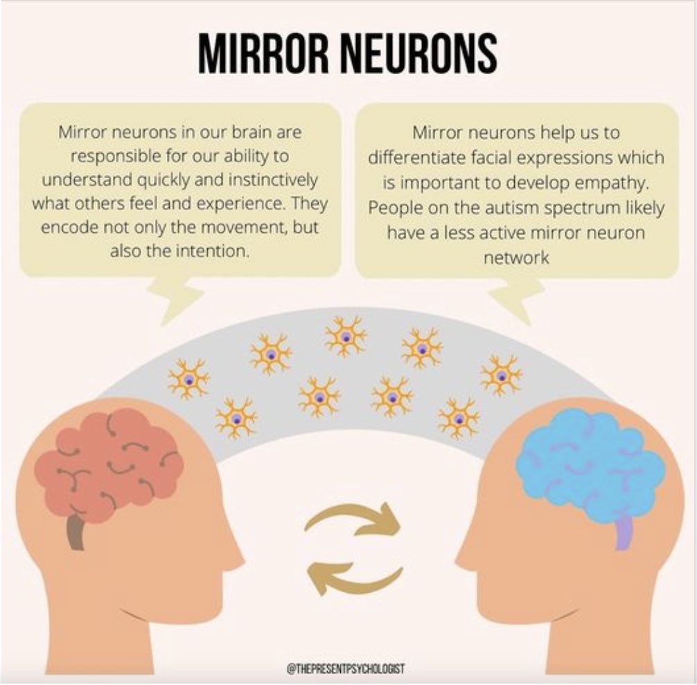📑 | عندما تبتسم الام ويبتسم الطفل، فهذا يعني ان الخلايا العصبية المرآتية تعمل، والطفل الذي لا يشعر بجسده وليس بارعا في التواصل اللفظي، يفتقر الى المهارات التي تميز صرخة الفرح عن صرخة الخوف، وسيكافح من اجل تكوين صداقات والتفاعل مع الاخرين، ولن يكون لديهم القدرة على فهم التعبير.