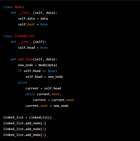 ينشئ هذا الكود قائمة مرتبطة linked list، مع فئة القائمة المرتبطة التي تحتوي على عقدة رئيسية node وطريقة لإضافة عقدة إلى القائمة المرتبطة