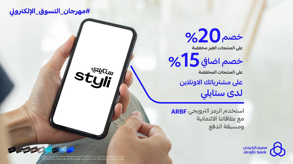 نفسيتك عدليها بالملابس الجديدة من تطبيق وموقع ستايلي الإلكتروني وبخصم حتى 20% مع بطاقات #مصرف_الراجحي الائتمانية ومسبقة الدفع 😎💳