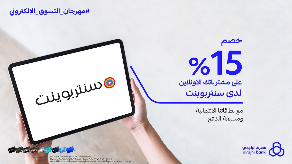 بخصم 15% على مشتريات الاونلاين من سنتربوينت بإستخدام بطاقات #مصرف_الراجحي الائتمانية ومسبقة الدفع 💳