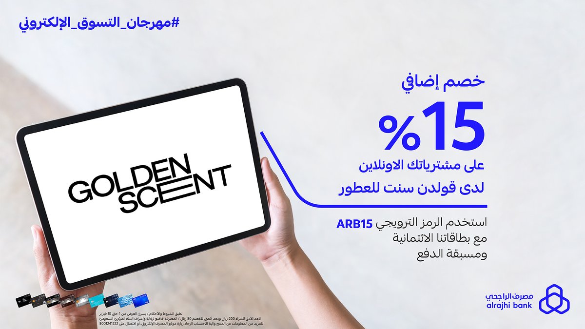 عطورك المفضلة بخصم إضافي 15% على مشتريات الاونلاين لدى قولدن سنت للعطور باستخدام بطاقات #مصرف_الراجحي الائتمانية ومسبقة الدفع 💳🤩