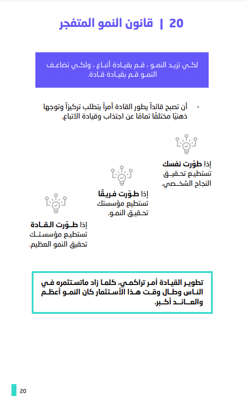 استنبط ماكسويل من خبرته 21 قانون في القيادة وهي كما يلي :