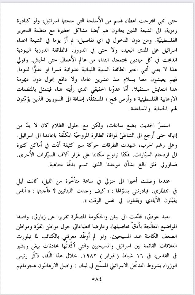 في مذكراته، كتب رئيس الوزراء الإسرائيلي الراحل إرييل شارون: "لم أرَ يوما في الشيعة أعداء إسرائيل على المدى البعيد"، شارون، أضاف في مذكراته: "توسعنا في كلامنا عن علاقات المسيحيين بسائر الطوائف الأخرى، لا سيّما الشيعة والدروز".=