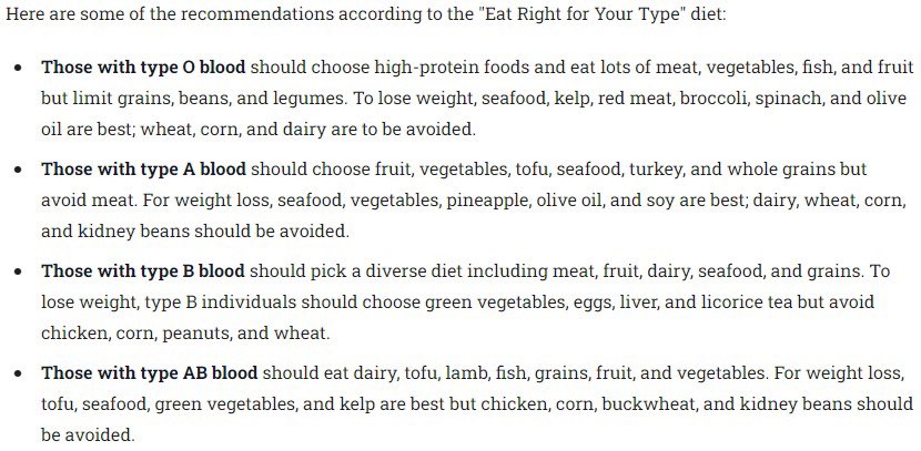 (1) تررد علي هذا السؤال كثيراً وهو هل هناك علاقة إيجابية بين النظام الغذائي الصحي وفصيلة الدم في الحفاظ على وزن الجسم المثالي والهضم السليم؟ بالمختصر المفيد أن هناك فقط توصيات لتناول بعض المأكولات الخاصة بكل فصيلة دم معينة ولكن ليس هناك دراسة تثبت العلاقة المباشرة بينهما.
