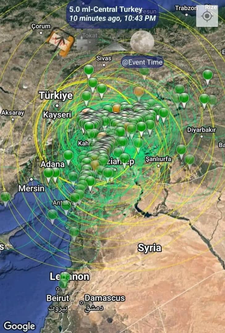 فقد. حدثت البارحه هزات بانحاء مختلفه في الشرق الأوسط كلبنان والاردن والعراق وعموم تركيا .....وهي مستمرة لحد الان .....ولا ( اتوقع ) ان تتوقف.... ان كان كلامي بانزلاق تلك الكتله الجيولوجيه الضخمه نحو البحر المتوسط صحيح....مماسينعكس على طول هذا الشق بحدوث هزات أرضية متلاحقه ....