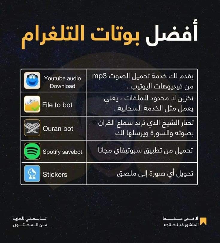 نبدا باهم هذه البوتات وافضلها على الاطلاق بوت القران الكريم حيث يعطيك مجموعة من القراء وتختار القارئ اللي تريد وبامكانك الاستماع او حفظ الصورة
