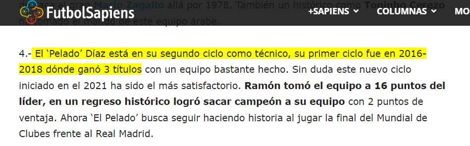 موقع "futbolsapiens" عن #الهلال: "مدربه دياز قاده في ولاية أولى وفاز بـ3 ألقاب مع فريق جيد الصنع. الولاية الثانية كانت أيضًا رائعة واستطاع المدرب تحقيق عودة تاريخية وحصد لقب الدوري بعد أن كان متأخرًا بفارق 16 نقطة. سيسعى دياز لمواصلة صنع التاريخ في مباراته أمام ريال مدريد".