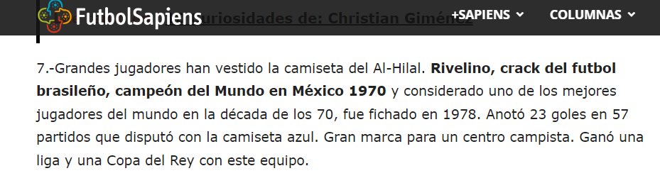 موقع "futbolsapiens" عن #الهلال: "لاعبون رائعون ارتدوا قميص النادي، أبرزهم البرازيلي ريفيلينو بطل العالم في المكسيك عام 1970، الذي يُعد من أفضل لاعبي العالم في السبعينيات، مع الهلال سجل 23 هدفًا في 57 مباراة لعبها بالقميص الأزرق. فاز بالدوري وكأس الملك مع هذا الفريق".