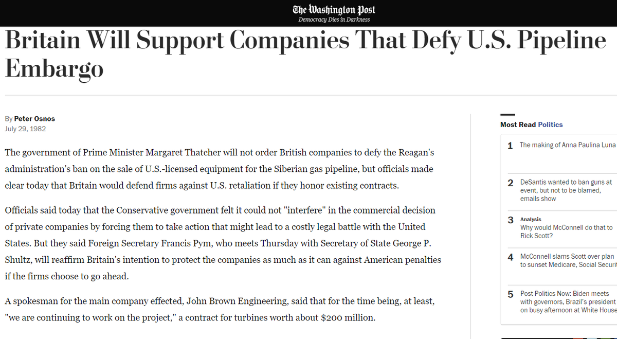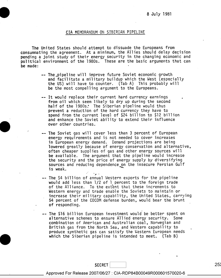 Il Dipartimento della Difesa (fc95d419f4478b3b6e5f-3f71d0fe2b653c4f00f32175760e96e7.r87.cf1.rackcdn.com) e la CIA (cia.gov) preparano memorandum sui rischi che il progetto comporta in quanto contrasterebbe con la politica di indebolire economicamente l'URSS e di conseguenza la sua capacità militare.