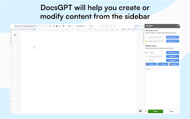 يمكن لهذه الإضافة إنشاء محتوى جديد من الصفر، وتعديل النصوص، وتغيير مستوى الكتابة، والترجمة إلى لغات أخرى، وحتى التدقيق اللغوي للأخطاء النحوية وعلامات الترقيم.