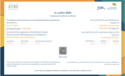 هي وثيقة معتمدة من وزارة الموارد البشرية والتنمية الاجتمـاعـيـة تمنح الأفـراد التسجيل في عدد مــن النشاطـات. وتتيح لهم فـرص ممارسة العمل بشكـل مستقل في النشاطـات التي أقـرتها الوزارة عبر البوابـة الإلكترونية للـعمـل الحر.