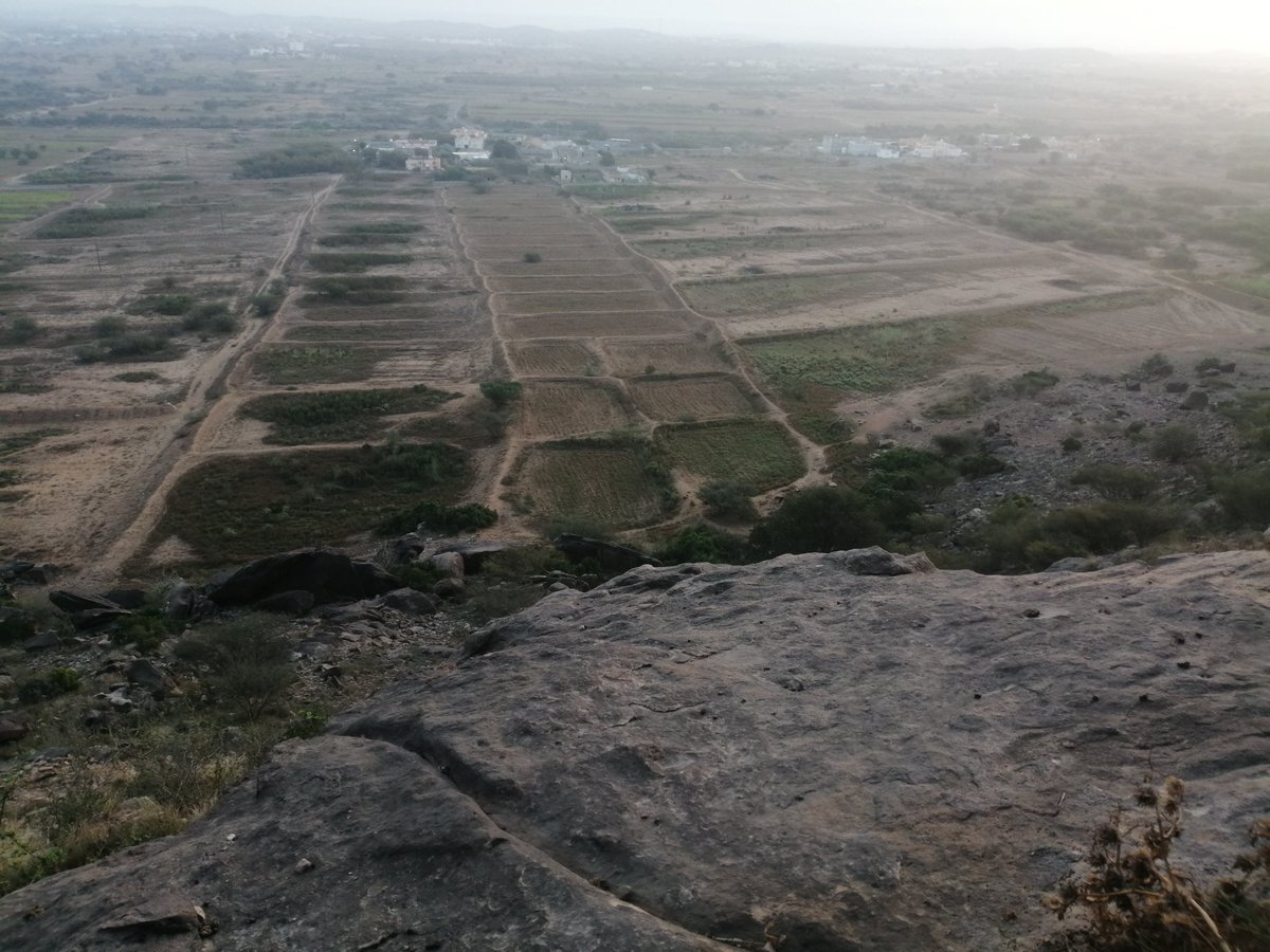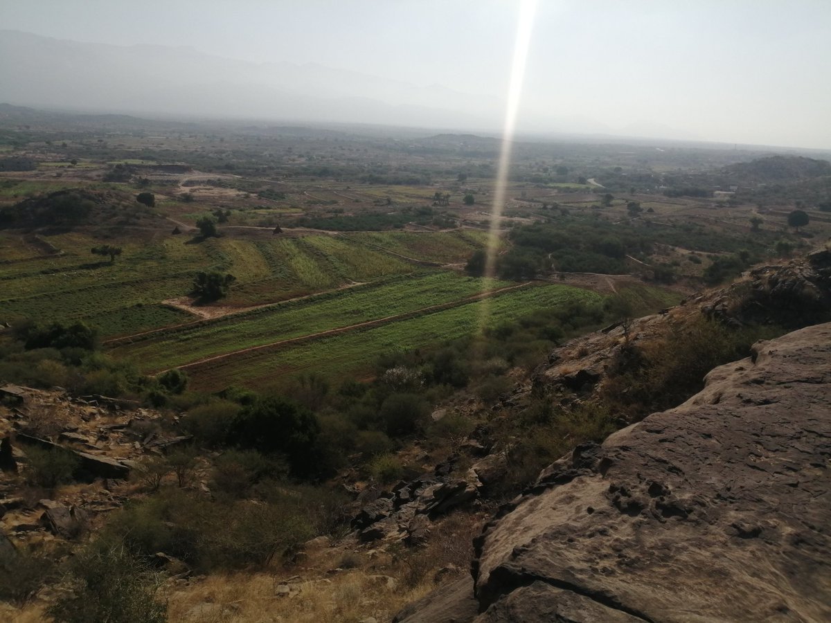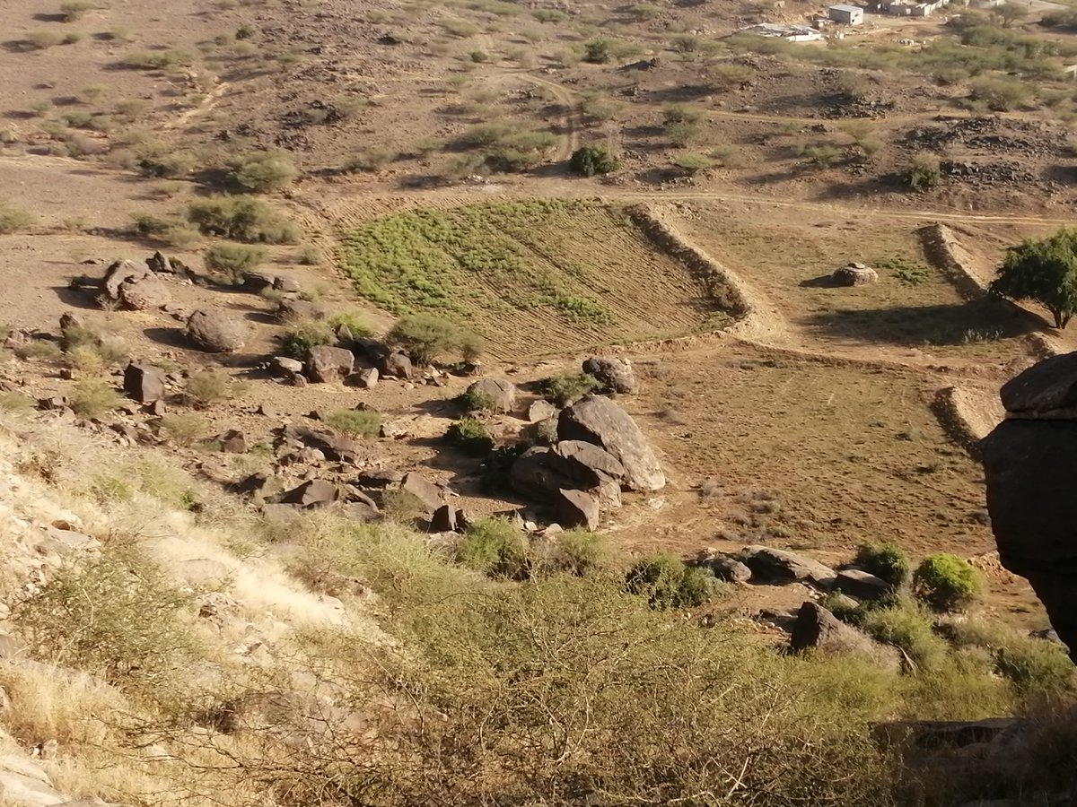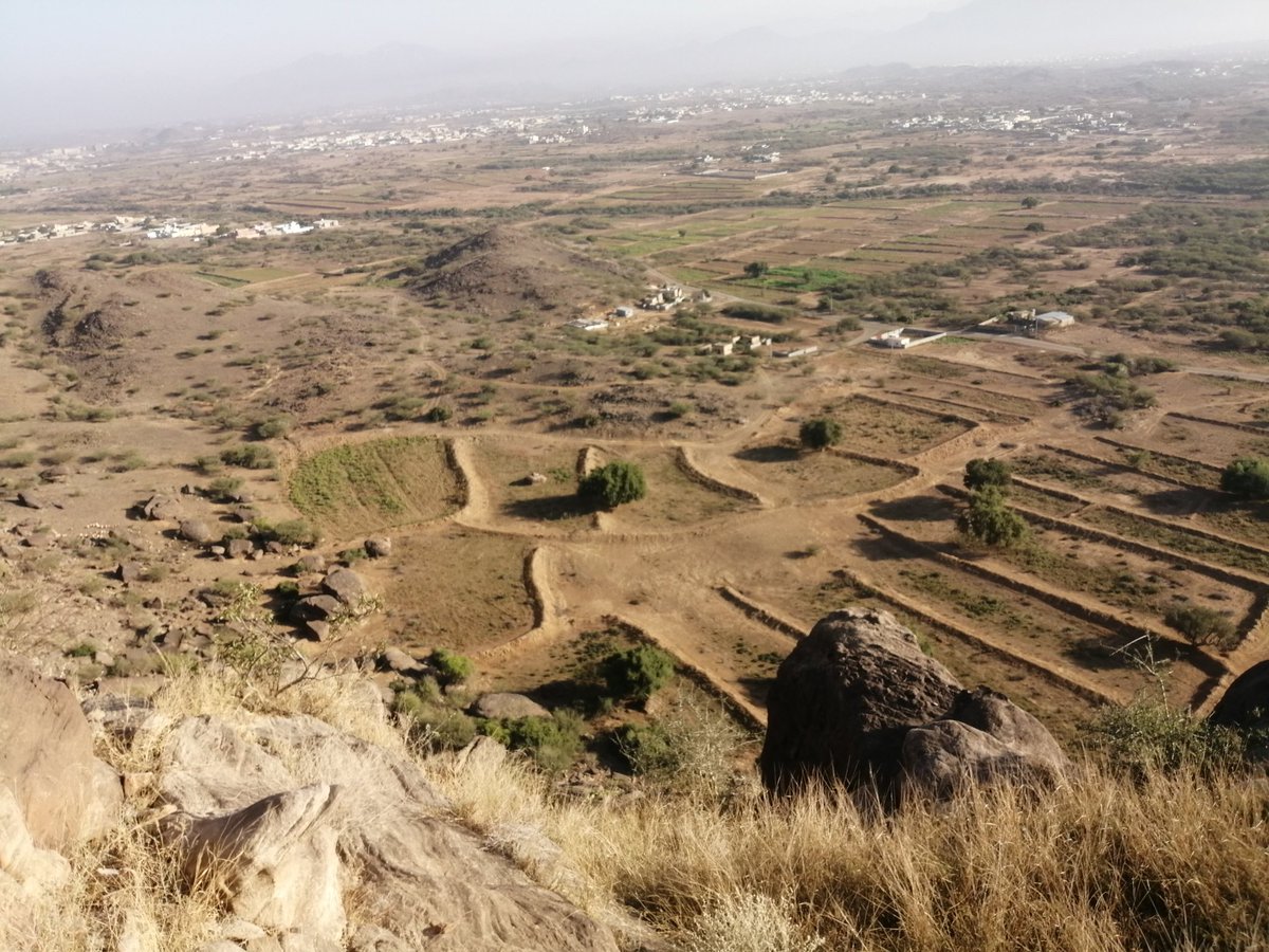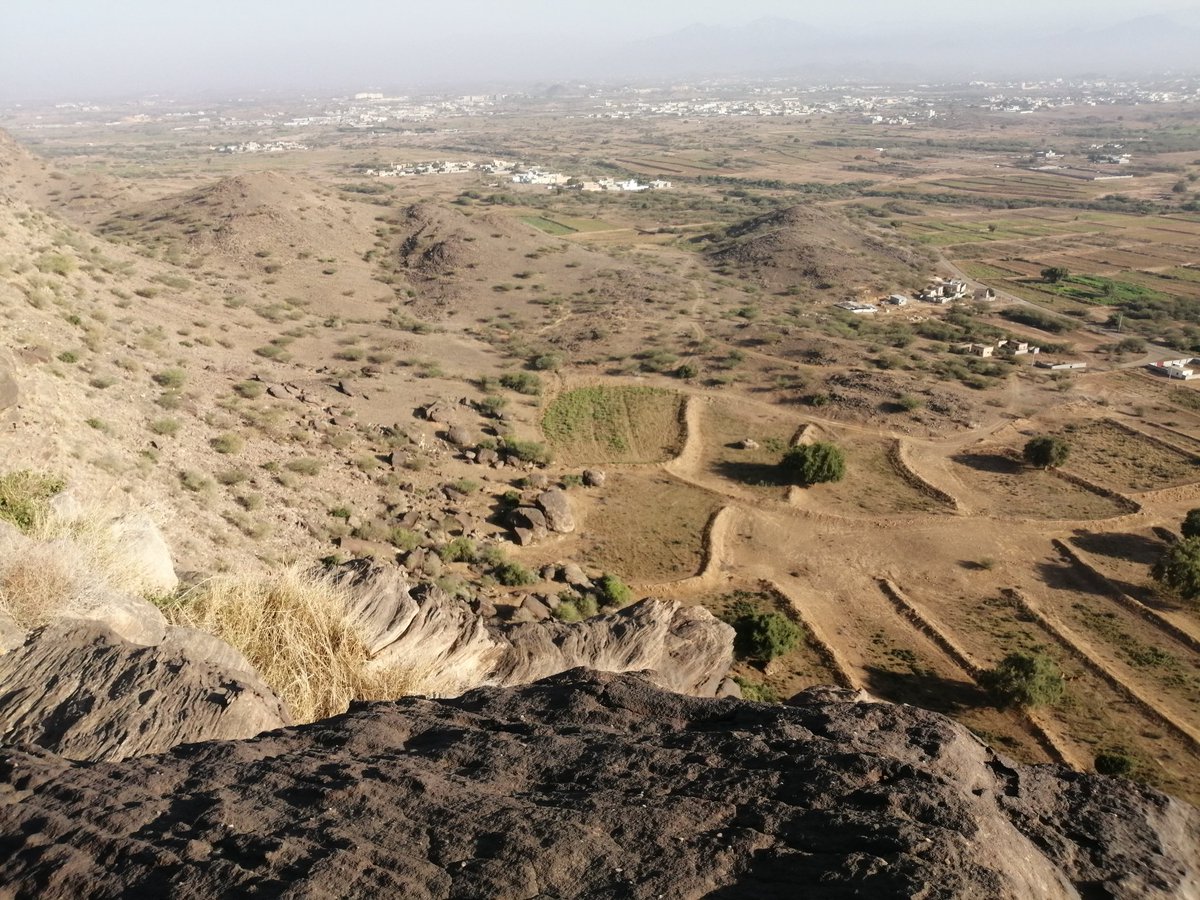 ٤-المسافة الفاصلة بين الجبل وبين القرى التي تقع شرقه تقريبا ٥٠٠م وهي أراضي زراعية لاصحاب تلك القرى وهي خصبة جدا ومقسمة لعدة قطع جميلة الترتيب وتستقي من الماء النازل من الجبل في موسم الأمطار