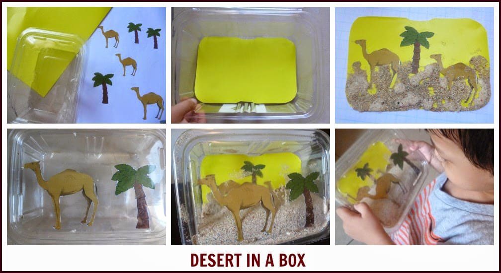 قصاصات ورق منوعة ( جمل -خيمة -نخلة…الخ ) نصمغ عليها أعواد خشبية وتثبت على الصلصال.