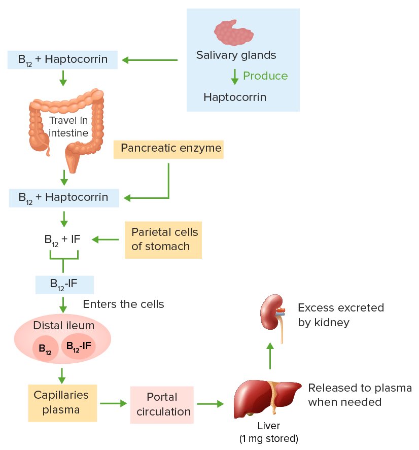 يتم تخزين B12 في الكبد ولسنوات طويلة جداً بعكس Folic acid الذي يحزن فقط لأشهر وهذا يجاوب السؤال الأول وهو أن النقص في Folic acid أسرع بشكل أكبر لقصر فترة تخزينه في الكبد