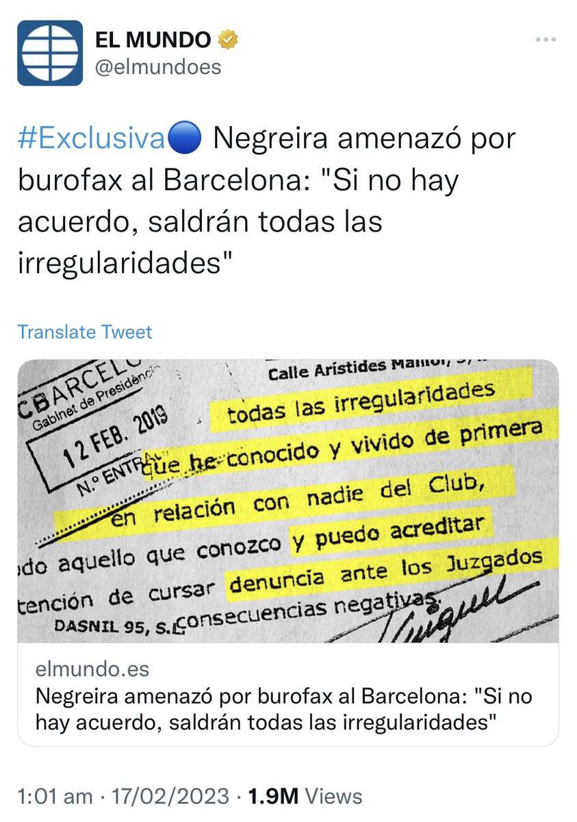 برشلونه دفعت مبالغ أخرى لإبن نيغريرا عن طريق شركة أخرى، ما تم دفعه للوالد من 2001 أكثر من 7 مليون €. رغم هذه الإيرادات لم تزيد أصول الشركة بل على العكس، أغلب السحوبات كانت تتم نقداً عن طريق ATM وهي أفضل وسيلة لمنع تتبع الأموال.