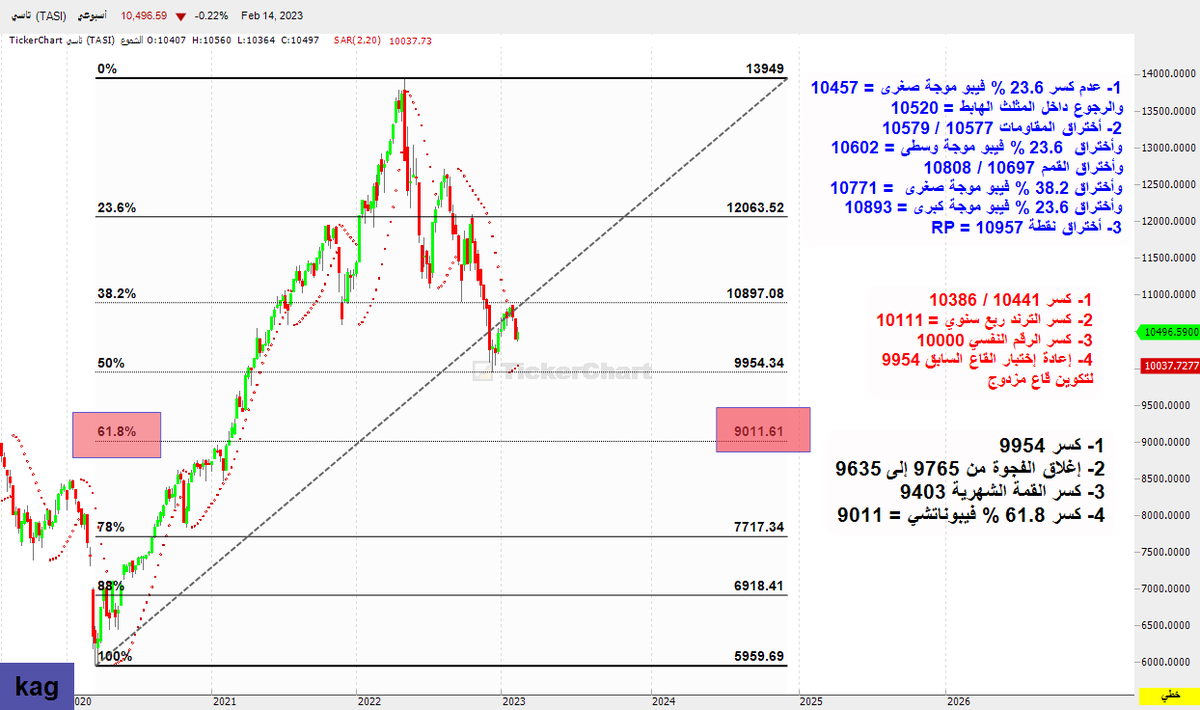 وصلنا اليوم الأثنين ٢٧ فبراير لنقطة إعادة إختيار القاع السابق وسجل المؤشر الأدنى ٩٩٦٣ بقرب القاع السابق ٩٩٥٠ ونسبة ٥٠٪ فيبو من قاع كورونا ٩٩٥٤