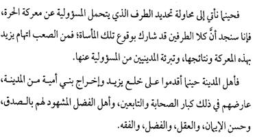 1 لما جاء ابن عمر إلى عبدالله بن مطيع حينما نزعوا بيعة يزيد قال ابن مطيع: اطرحوا لابي عبدالرحمن وسادة... لم يذكر ابن مطيع و الذين معه شيئا عن شرب الخمر أو ما شابه ذلك, و إلا لبينوا الحق في سبب خروجهم