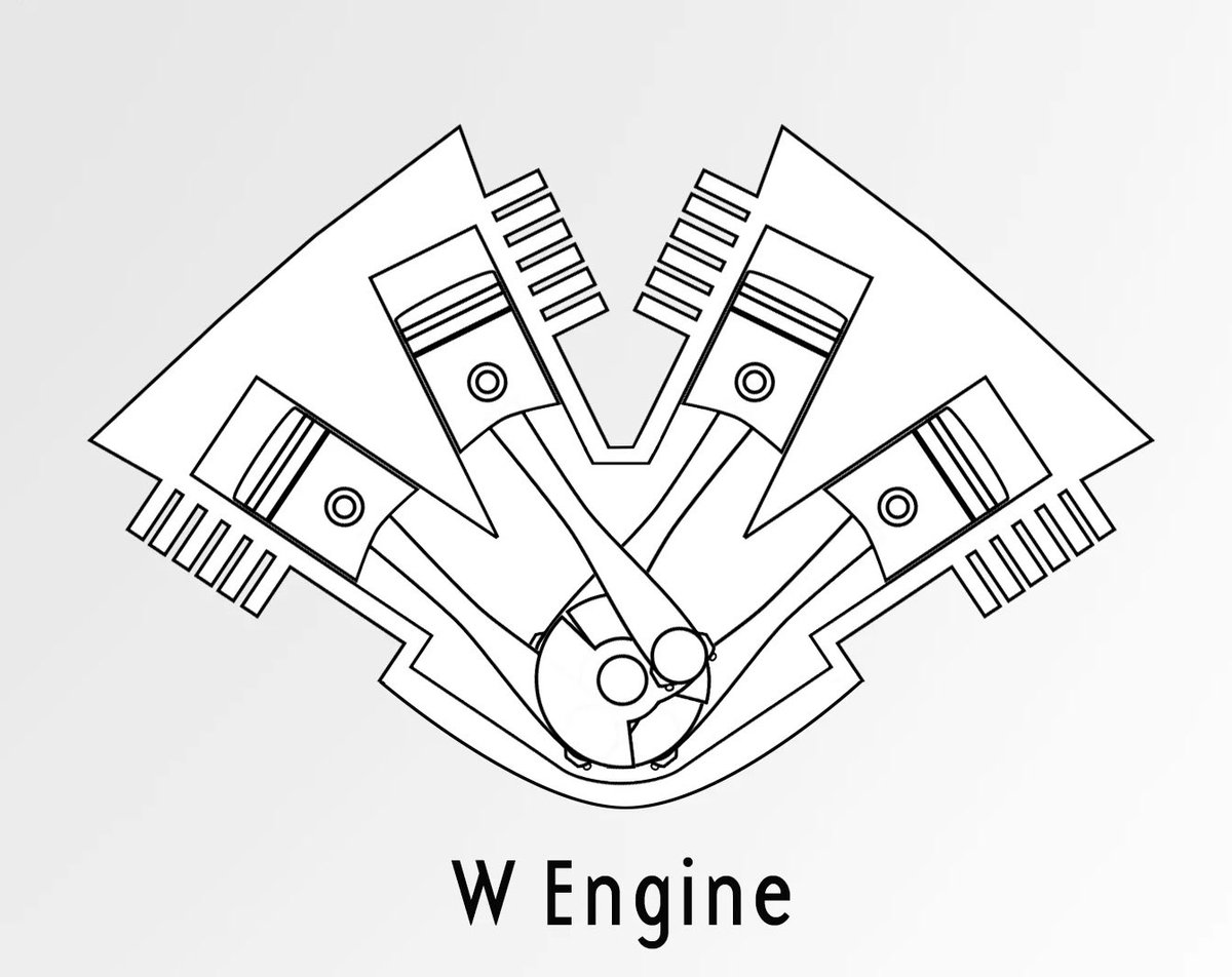 محركات على شكل W ومن اشهرها الW12 محرك البنتلي "فولكسفاجن" ومحرك البوقاتي الW16 وميزة محركات W تصغير حجم المحرك