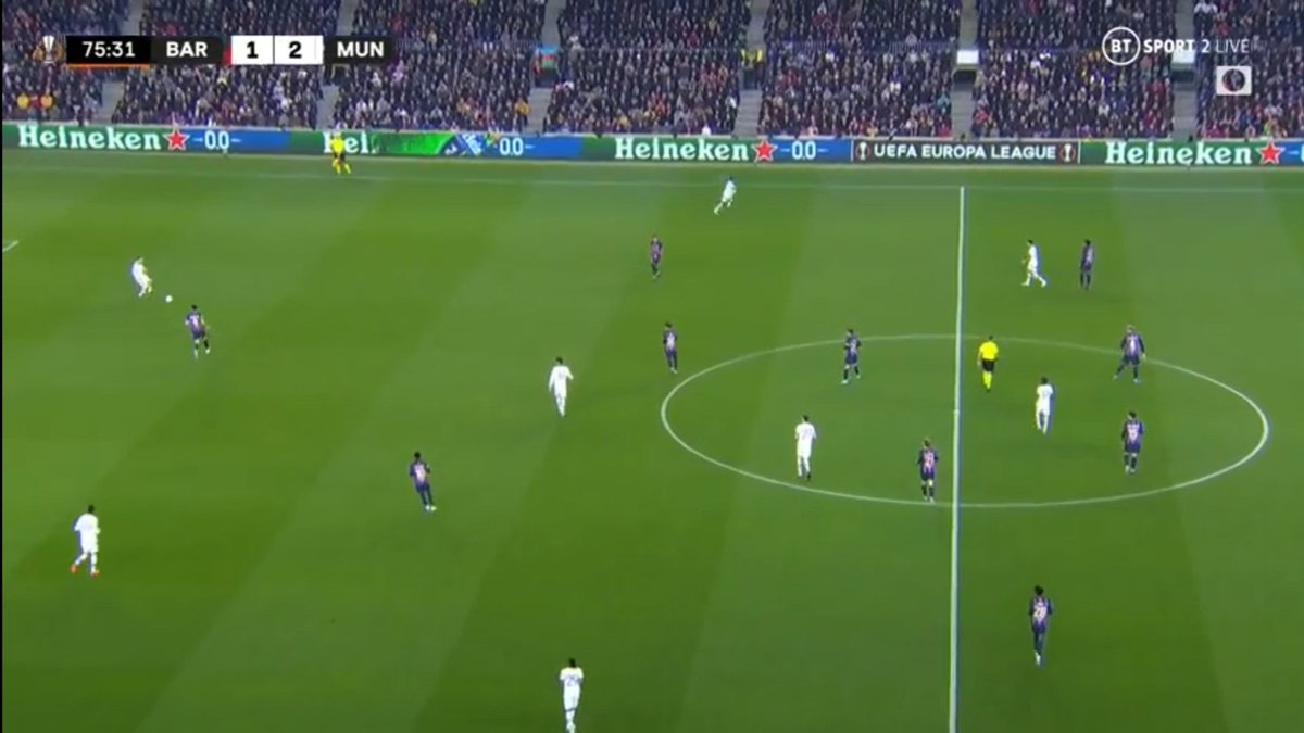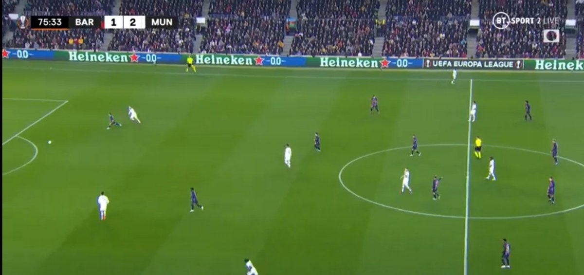 رافينيا بيبدأ يعمل scan للمنطقة بتاعته في الملعب وبيبص حواليه لإنه لاحظ ان تمركزات لاعيبة اليونايتد مش مظبوطة (مالاسيا متقدم كتير ومفيش لاعب إضافي نزل عشان يساعدهم في الطلوع بالكورة)