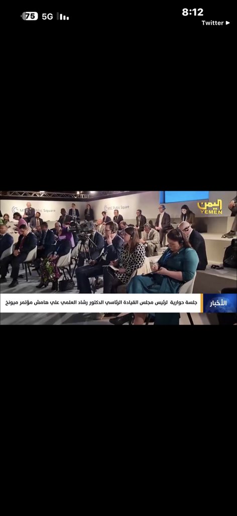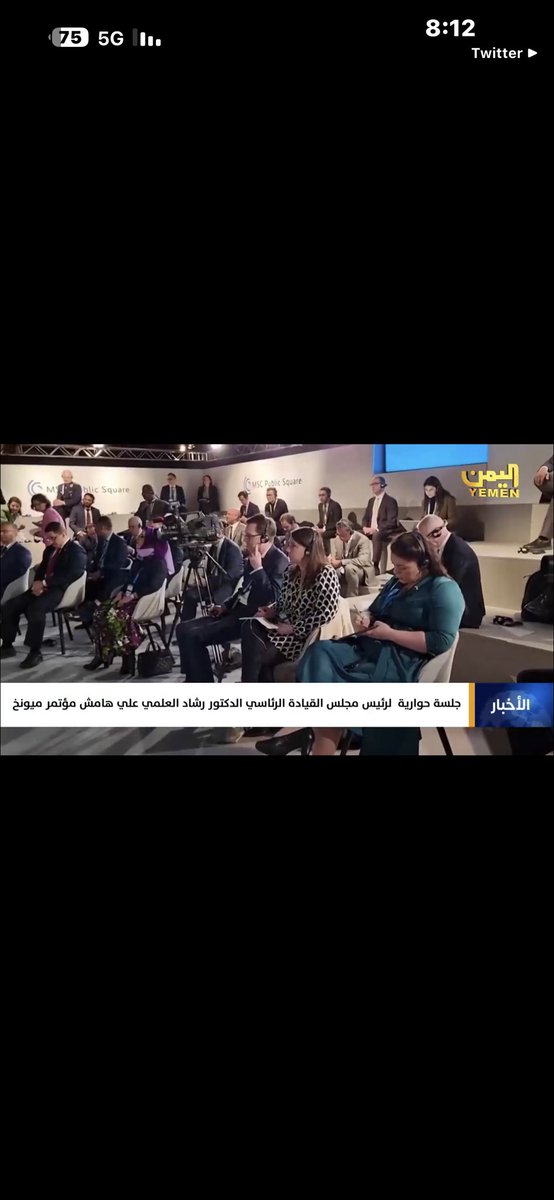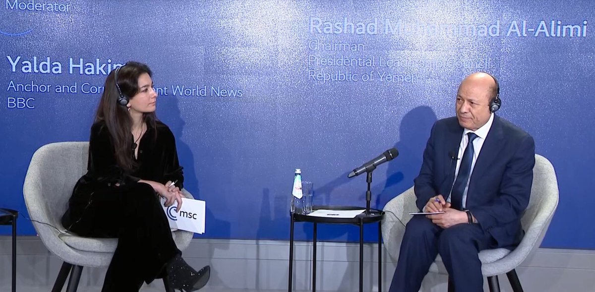الجلسة الحوارية التي أجراها فخامة الرئيس الدكتور رشاد العليمي رئيس مجلس القيادة الرئاسي، على هامش مؤتمر ميونيخ للأمن التاسع والخمسين الذي تستضيفه المدينة الالمانية كل عام بحضور حشد كبير من القادة ورؤساء الحكومات، والمنظمات، والصحفيين من مختلف انحاء العالم