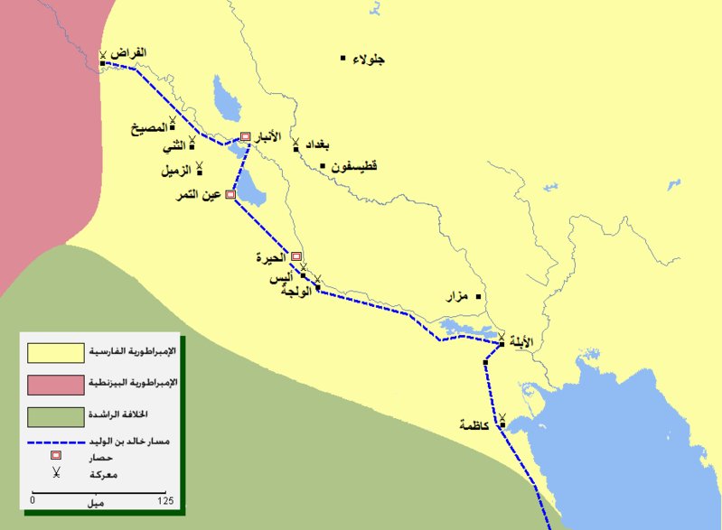 قال خالد: « بل اعبروا الينا، قالوا فتنحوا حتى نعبر »، فقال خالد : « لانفعل ولكن اعبروا أسفل منا »، فقالت الروم وفارس بعضهم لبعض احتسبوا ملككم. هذا رجل يقاتل على دين. وله عقل وعلم والله لينصرن ولنخذلن.