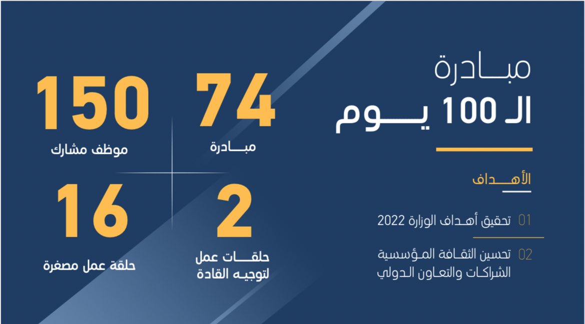 عززنا من الثقافة المؤسسية والشراكات والتعاون الدولي عبر مبادرة الـ100 يوم للعام 2022، مع 74 مبادرة بمشاركة 150 موظف، في 16 حلقة عمل مصغرة، وحلقتين عمل لتوجيه القادة؛ #لمجتمعات_مزدهرة