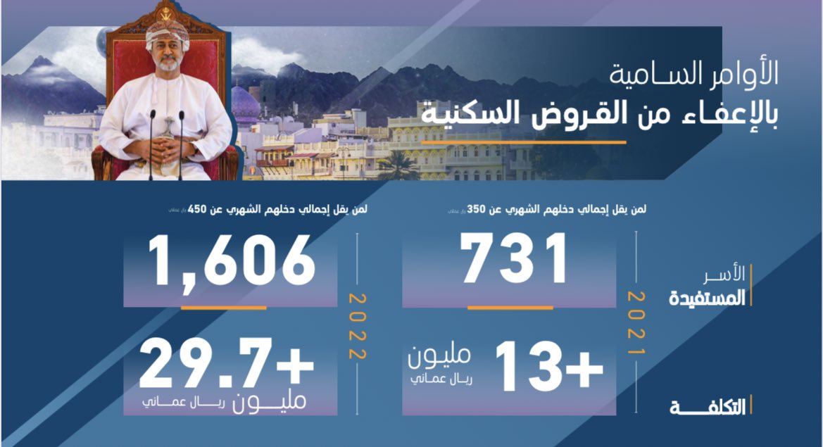 ومن استقرار الأسر توجهنا، وبالأوامر السامية عززنا ذلك بالإعفاء من القروض السكنية ليبلغ عدد الأسر المستفيدة خلال العام 2021 أكثر من 700 أسرة بتكلفة مالية تجاوزت 13 مليون ر.ع، وأكثر من 1600 أسرة مستفيدة بتكلفة تعدت 29.7 مليون ر.ع في العام 2022.