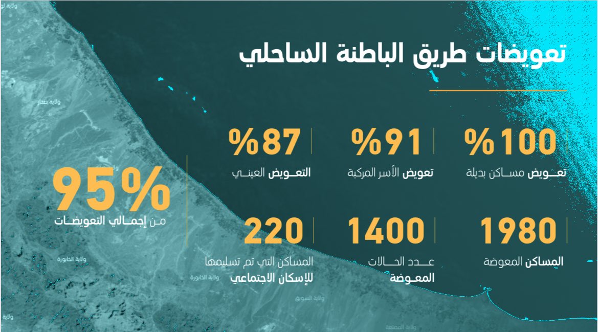واضافة، تبرز نتائج تعويضات طريق الباطنة الساحلي في 2022، حيث تم تعويض مساكن بمساكن بديلة بنسبة 100% بعدد تجاوز 190 ألف، وتعويض أسر مركبة بنسبة 91% بواقع عدد وحدات سكنية بلغ عددها 1400 حالة حالة، ونسبة تعويض عيني 87% بعدد مساكن 220 تم تسليمها، بإجمالي 95%.