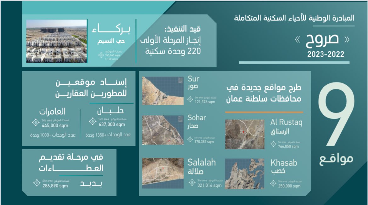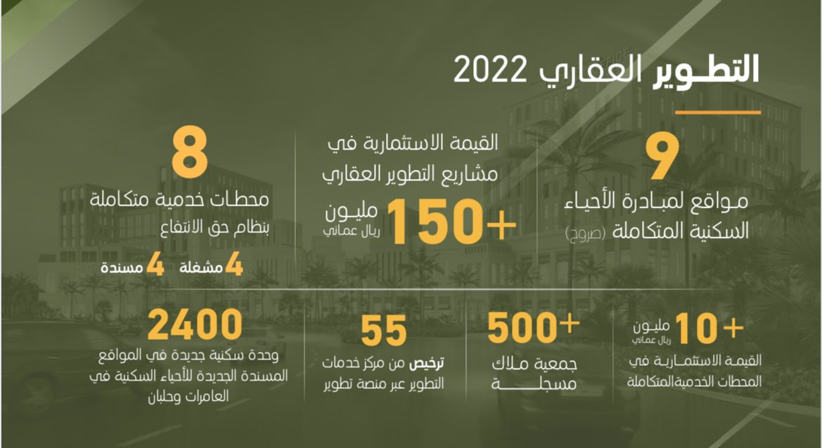 نحقق تقدمًا واضحَا في مشاريع التطوير العقاري بقيمة استثمارية تعدت 150 مليون ر.ع ضمن المبادرة الوطنية للأحياء السكنية المتكاملة (صروح)، كما برزت القيمة الاستثمارية المحققة من المحطات الخدمية المتكاملة بتجاوزها 10 مليون ر.ع لعدد 8 محطات بنظام حق الانتفاع🔻