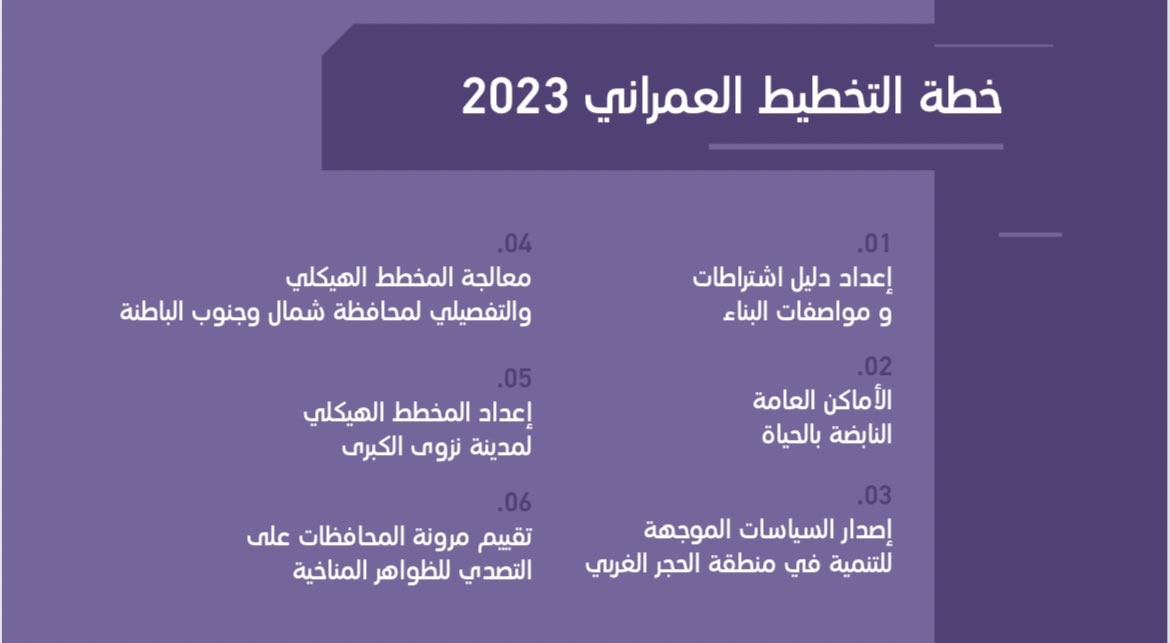 وتأكيدًا على مخرجات @onss_oman ، نعمل على إعداد مخططات هيكلية للمراكز الإقليمية للمحافظات كولاية عبري، الرستاق، صور، إبراء، البريمي، هيما والتي تهدف إلى إعداد خطة شاملة لجميع استخدامات الأراضي ونطاقات البناء وما يتعلق بالحركة والمواقع والمناظر الطبيعية والبيئية.