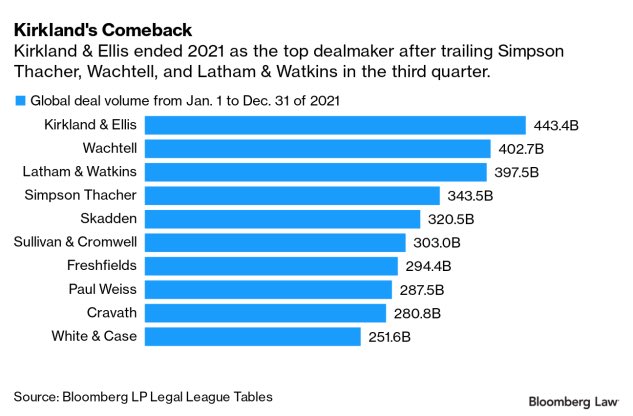 أكبر ”صانع صفقات بالعالم“ هي شركة Kirkland & Ellis للمحاماة. متجاوزة بذلك شركة محاماة Wachtell. باجمالي صفقات اندماج واستحواذ بلغت قيمتها 5 ترليون دولار.