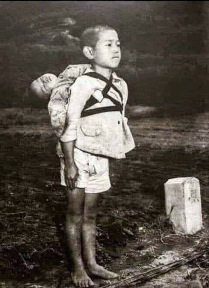 يقول مصورها (جو اودونيل) :"تقدم الطفل حاملاً شقيقه الرضيع الميت على ظهره بثبات، كان يعض على شفته كي يمنع نفسه من البكاء، كان يقف متأثراً بالوقفة العسكرية! كان ينتظر دوره في المكان المخصص لمراسم حرق الجثث حسب التقاليد اليابانية لحرق شقيقه الصغير...