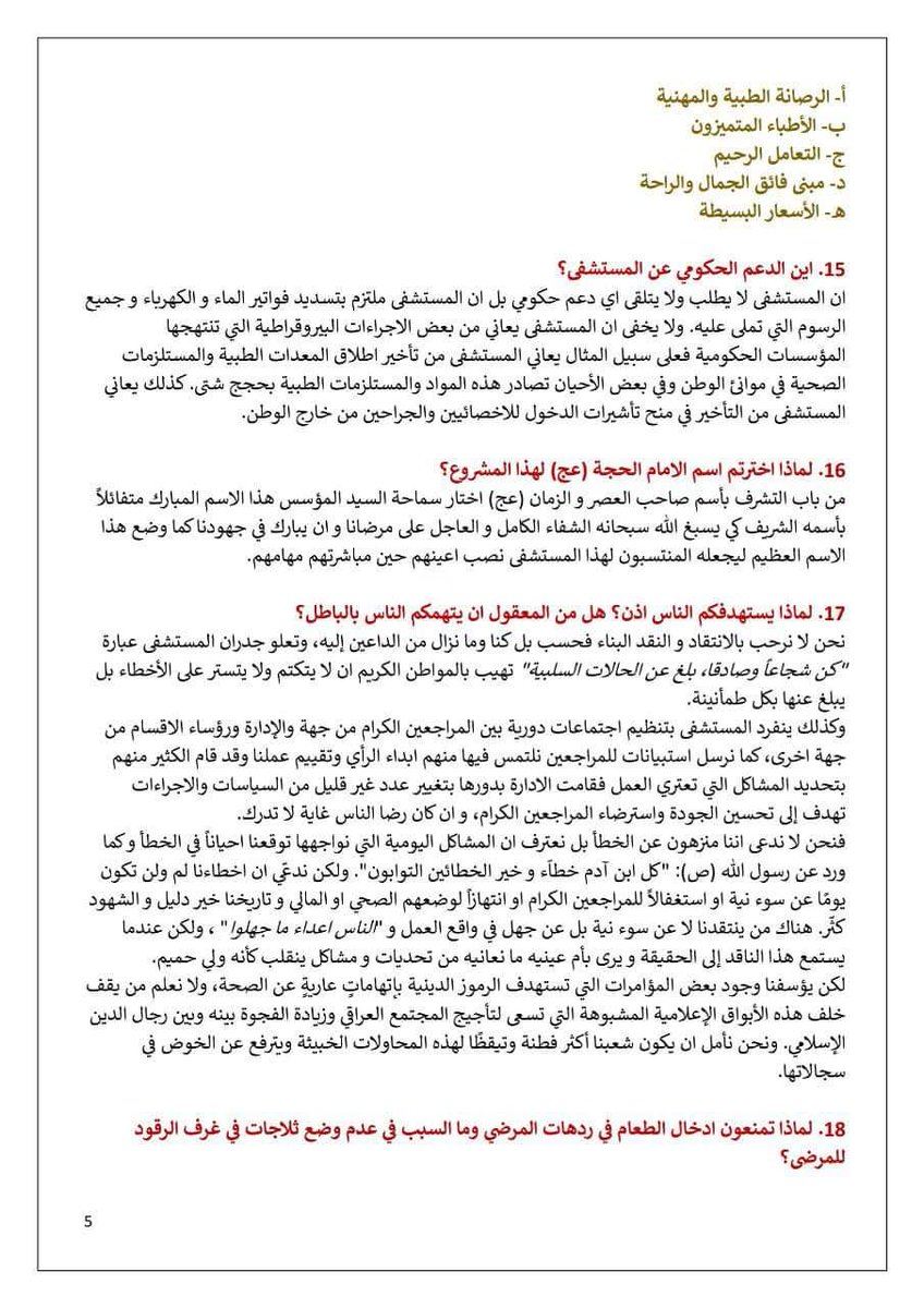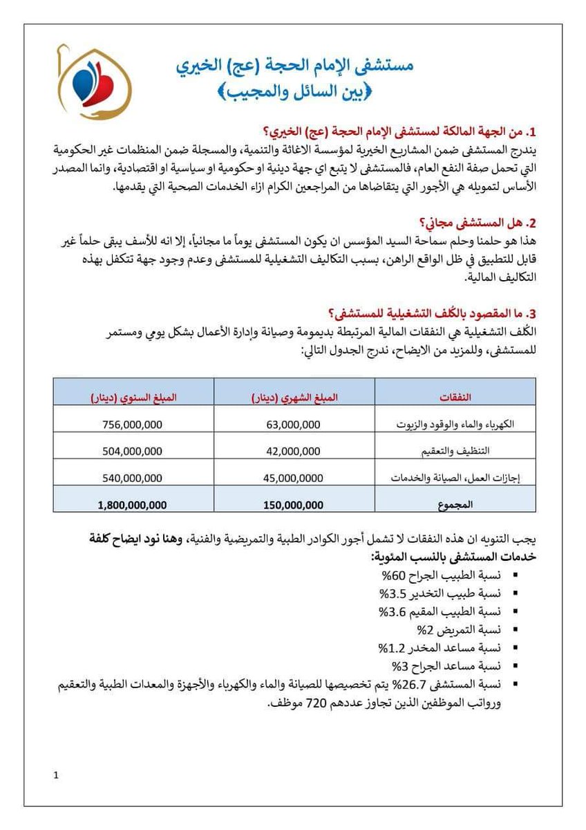 3. التبرعات التي وصلت للمستشفى كانت من أجل المساهمة في تشييد المبنى وشراء الأجهزة الطبية وليست لدفع أجور الاطباء وصيانة الأجهزة ورواتب الأطباء والعاملين والوقود والكهرباء، وكانت كل هذه التبرعات من رجال تجار مؤمنين وجهات دينية صرفة ولم يدفع أي شخص ممن ينتقد المستشفى ديناراً فيها⤵️