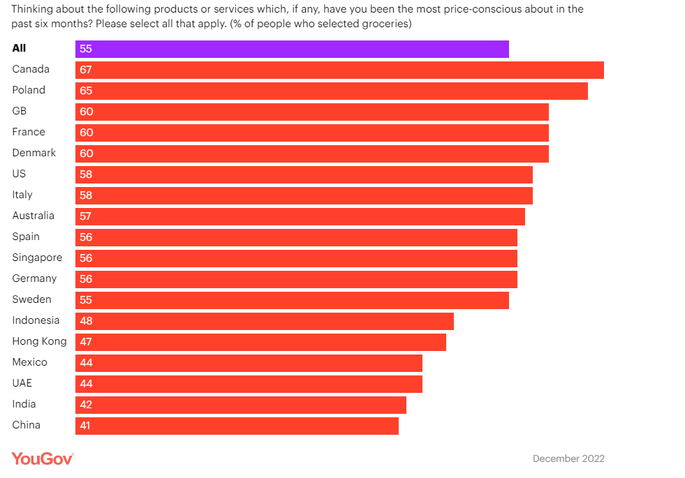 في بعض المناطق الأوروبية ، يهتم أكثر من ثلثي المستهلكين (بولندا ، 65٪ ؛ بريطانيا العظمى ، 60٪ ؛ فرنسا ، 60٪ ؛ الدنمارك ، 60٪) بتكلفة منتجات البقالة.