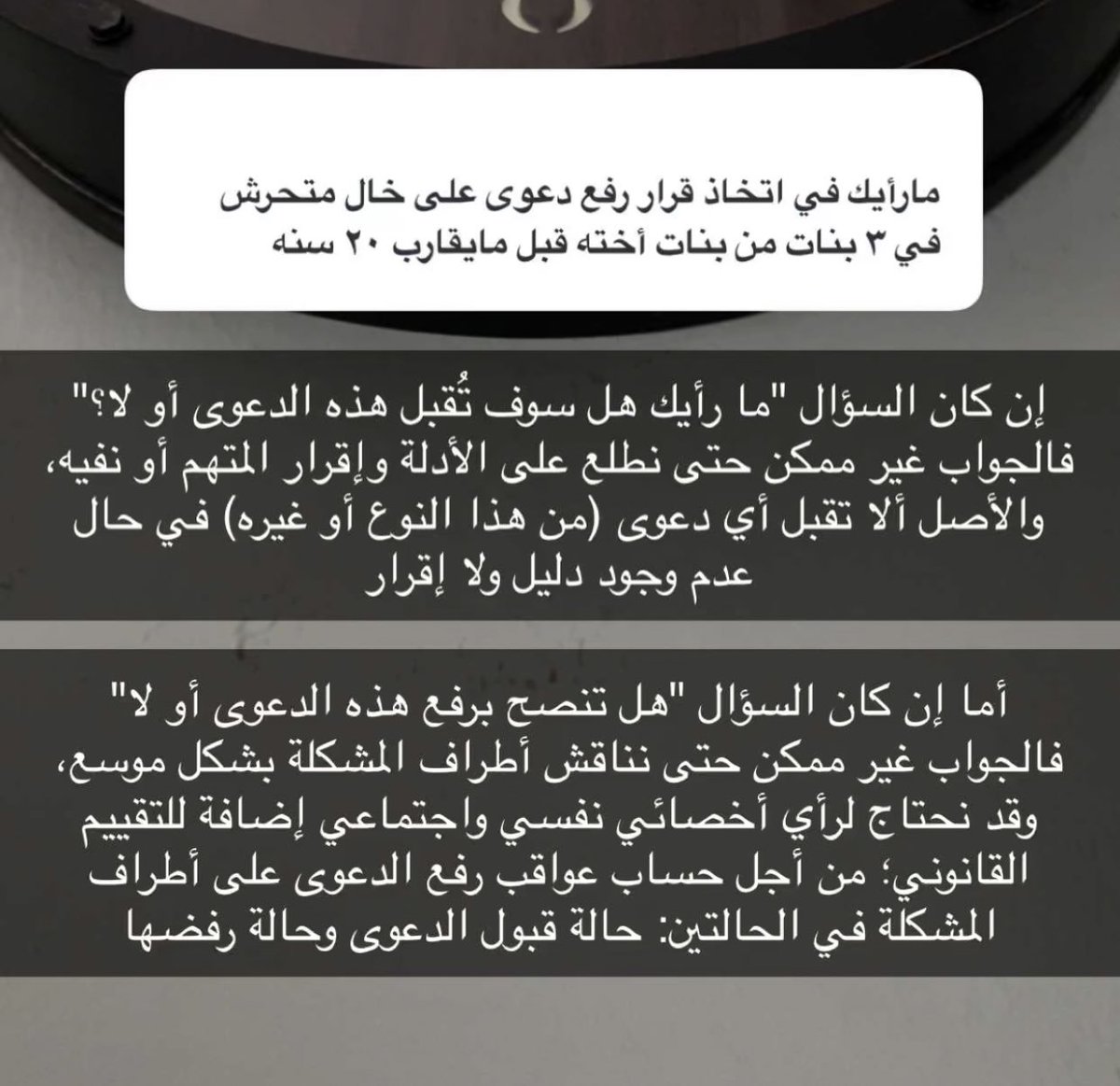 مما ينبغي أن يستحضره مقدم الاستشارة القانونية هو أهمية وفائدة الطريقة الثانية -الصورة- وذلك لعدة أسباب، وخصوصاً في القضايا ذات الشق الجنائي والأسري، لأن رفع الدعاوى له تبعات، هذه التبعات تختلف من واقعة لأخرى، وقد تكون التبعات تضر الشاكي بضرر أكبر مما لو سكت، فيكون نصحك له=