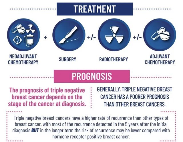 (3) يصنف #TNBC على أنه مرض عدواني لأنه ينمو بسرعة ومن المرجح أن ينتشر بحلول الوقت الذي يتم اكتشافه فيه ومن المتوقع أن يتكرر حدوثه بعد العلاج أكثر من الأنواع الأخرى من #سرطان_الثدي ويعتبر تشخيص هذا النوع ليس جيدا كما هو الحال بالنسبة للأنواع الأخرى.